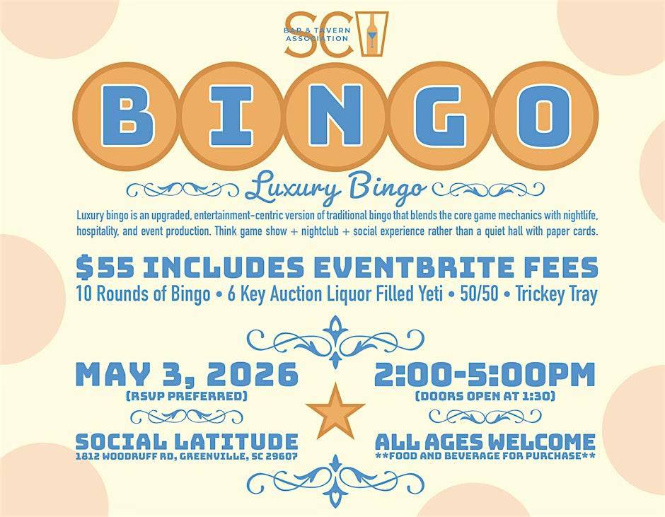 Bingo just got a glow-up. Luxury Bingo is your excuse for a night out that mixes games, prizes, and a high-energy social vibe – all while connecting with the SC Bar & Tavern Association community. Expect laughs, surprises, and a room full of people who know how to have a good time.